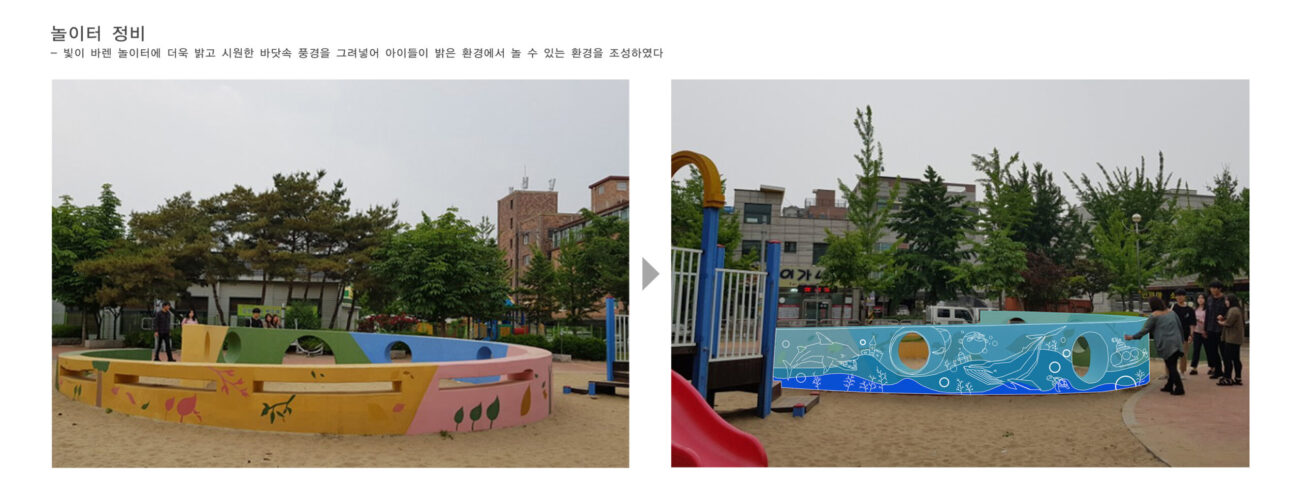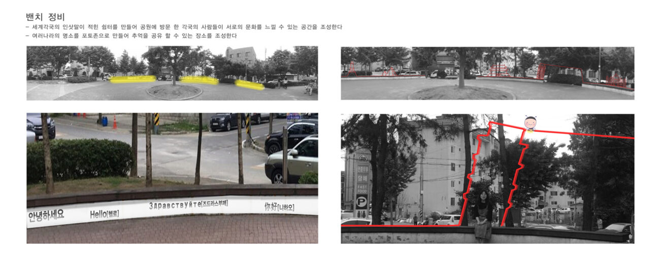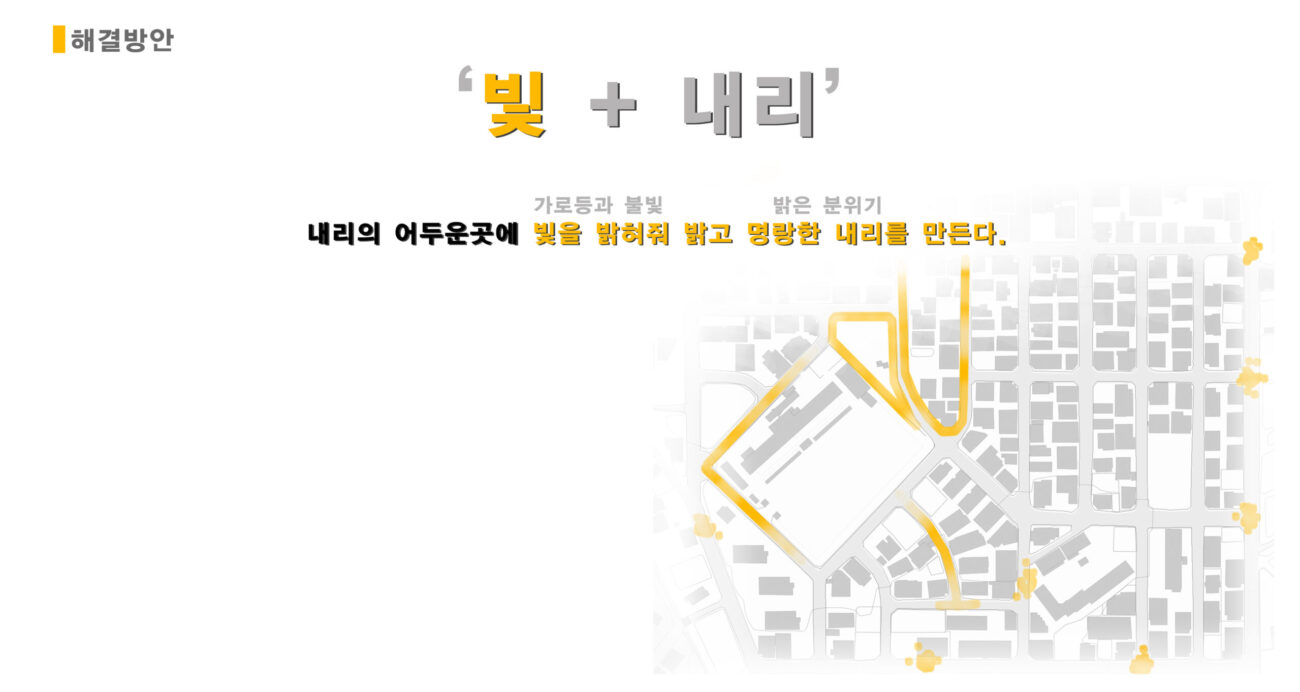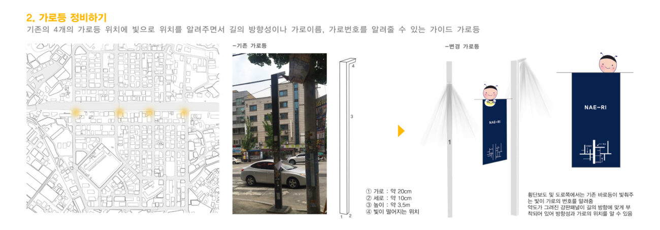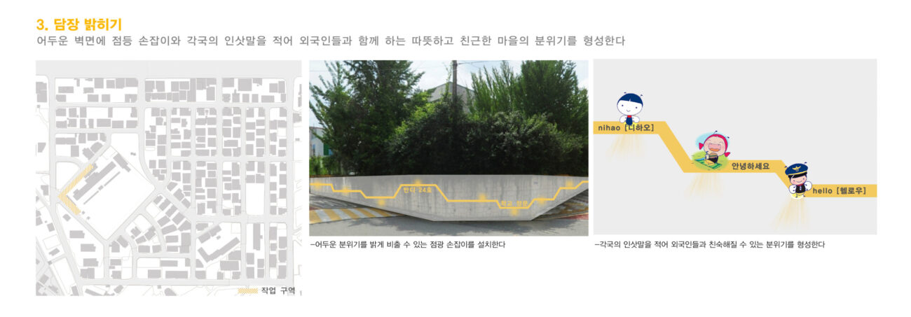 내방리는 외국인 주거율이 높고 동네가 정비되지 않은 특징을 가지고 있었기 때문에 다문화 주민들 간의 커뮤니티 형성과 어두운 환경을 밝힐 수 있는 계획을 중점으로 진행되었다.