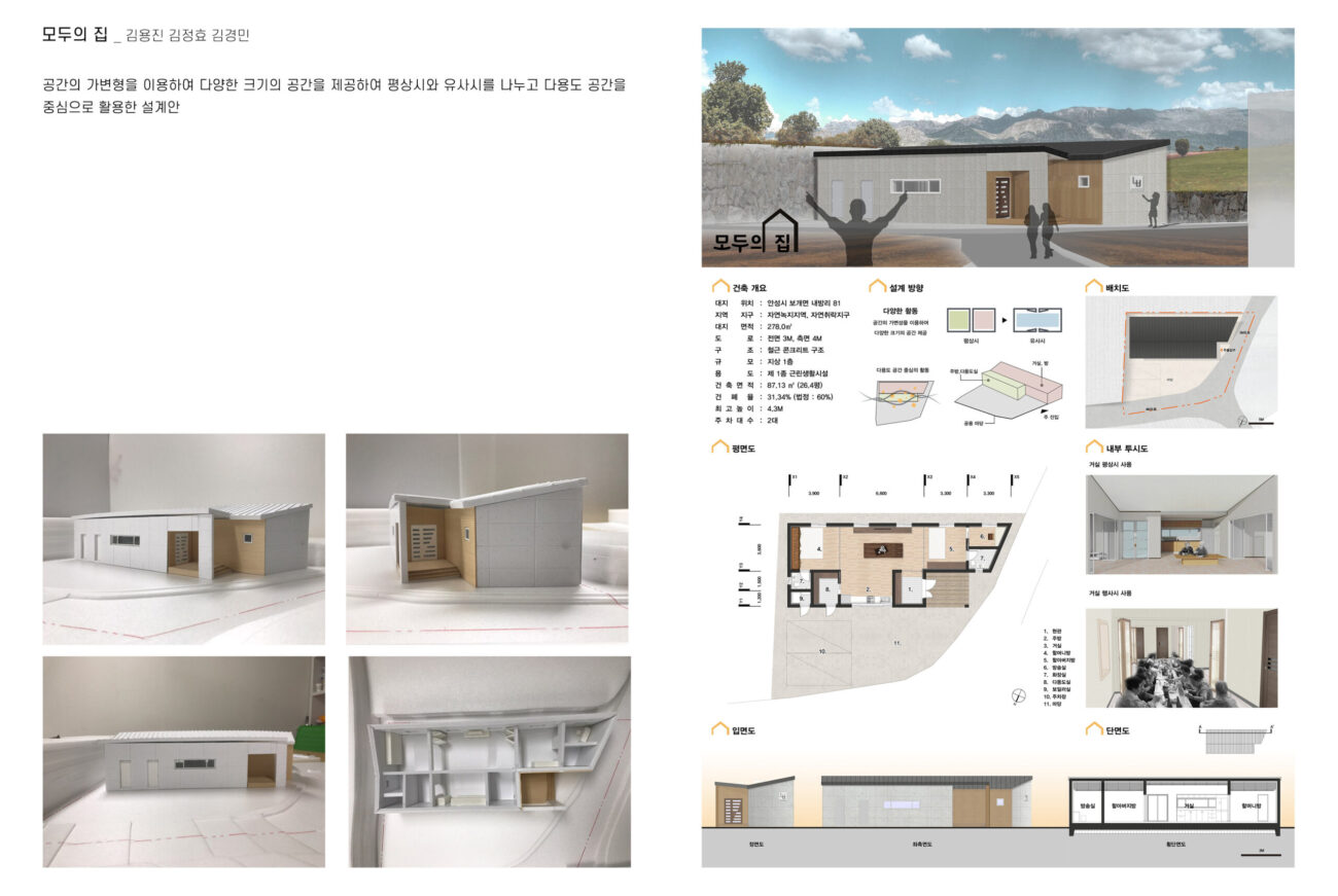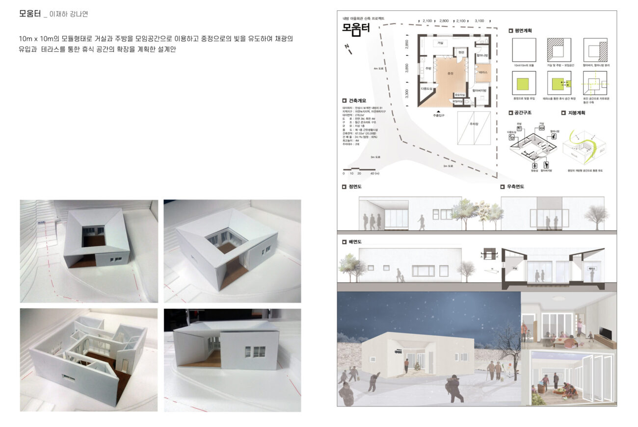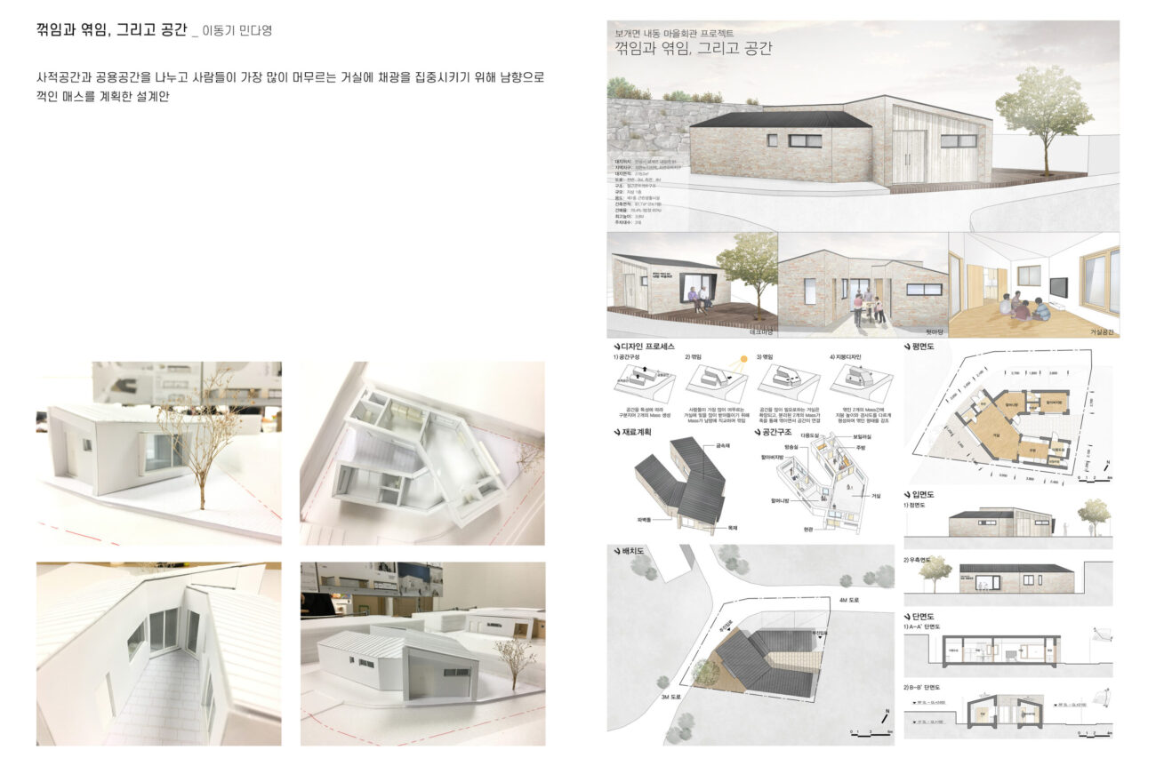 2016.12 – 2017.01 겨울 워크샵 내방리 마을회관 프로젝트 담당교수 김준경 참여학생 이동기, 강나연, 김경민, 김용진, 이재하, 김정효, 민다영 내방리 마을회관 프로젝트 보개면 내방리 이장님과 지역주민의 의뢰로 진행한 마을회관 설립을 위한 기본계획 프로젝트로 마을 주민들과 이장님 인터뷰 및 현장답사를 통해 설계 방향을 수립하고 참여 학생들이 팀 작업을 통해 3가지 계획안을 제시하였다. Project navigation