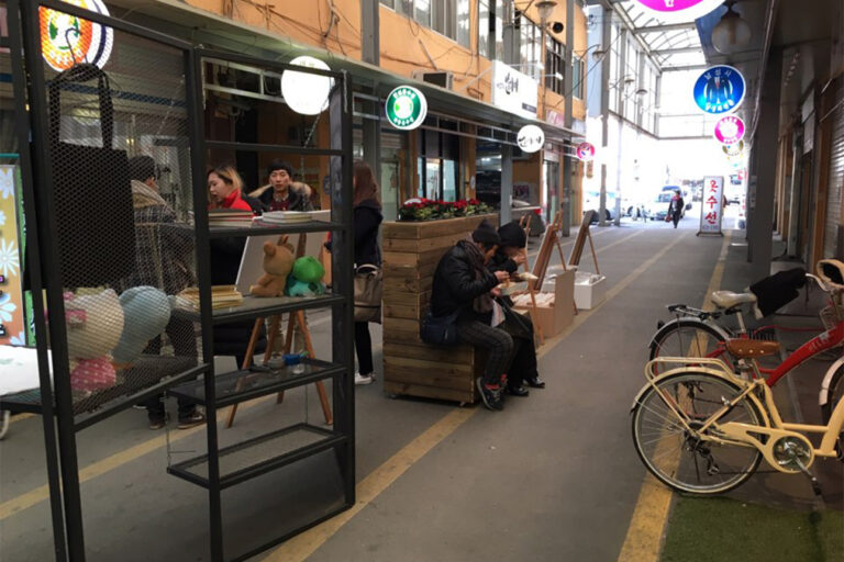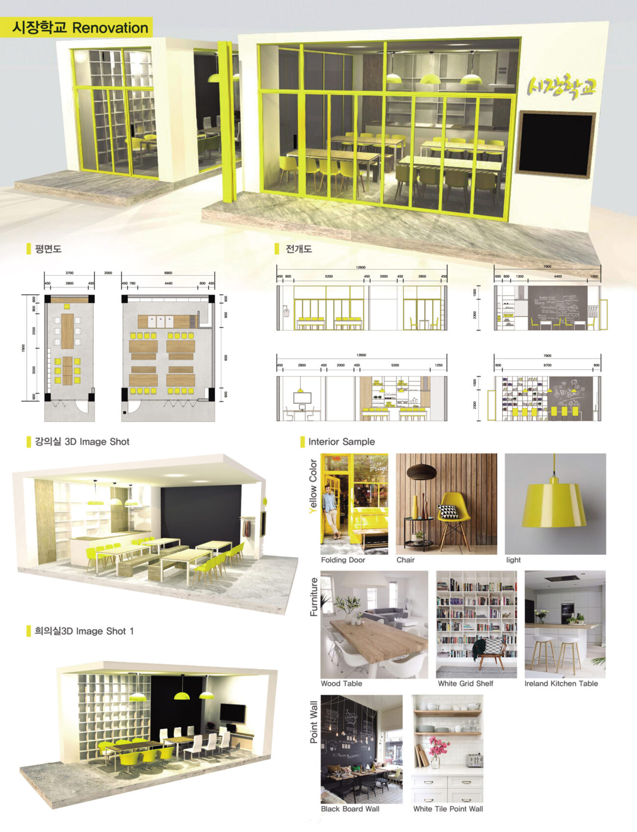 시장 속 빈 점포에 연령과 분야를 가리지 않고 다양한 사람들을 끌어모을 수 있는 교육 프로그램을 구성하여 판매 중심의 시장에서 판매와 교육이 공존하는 시장으로 변화하는 리모델링 계획안을 제안한다.