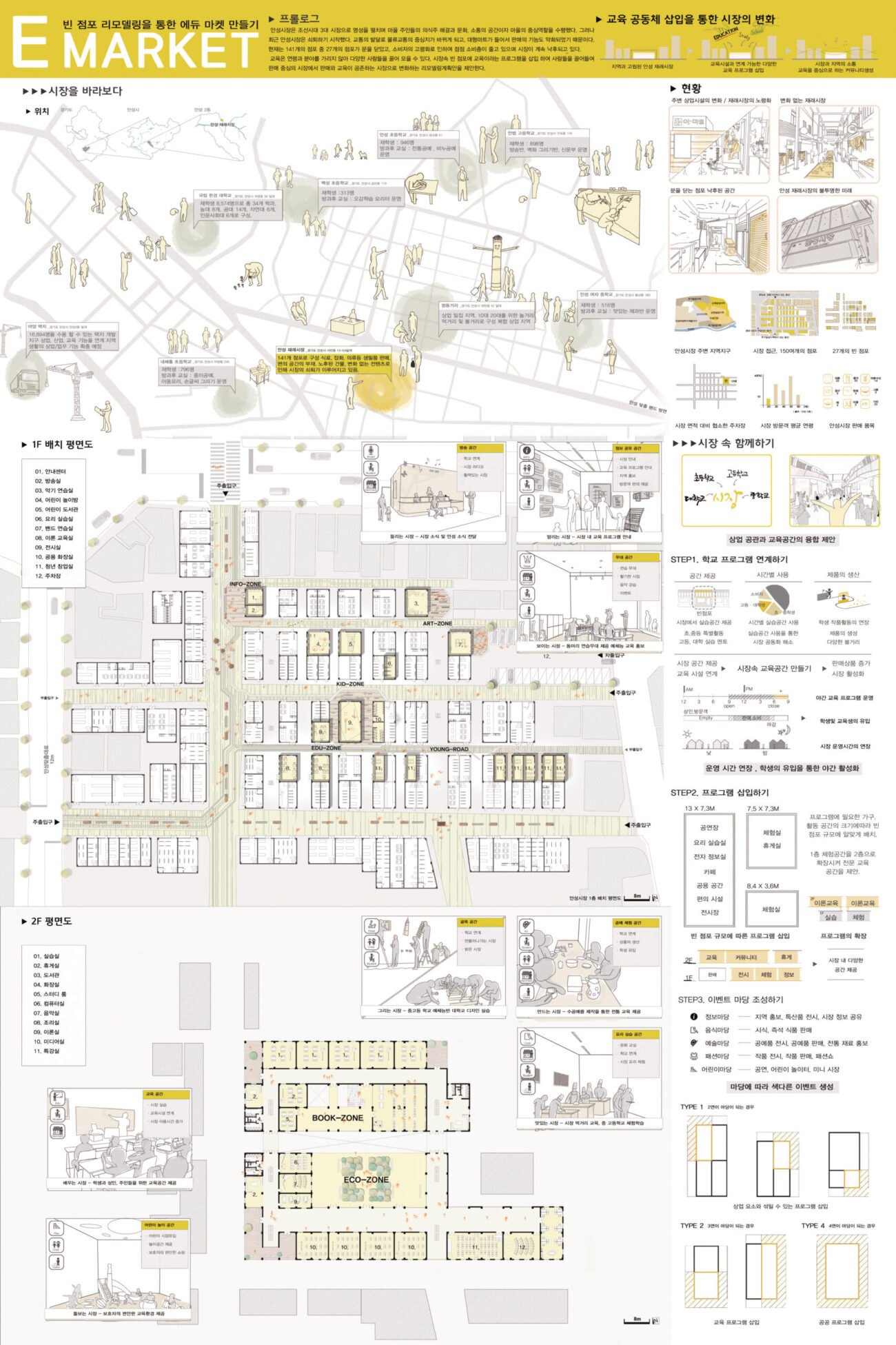 낙후되고 있는 안성 재래시장의 빈 점포를 리모델링하고, 교육 시설과 연계 가능한 다양한 교육 프로그램을 삽입하여 안성시장과 지역이 교육을 중심으로 커뮤니티가 생성될 수 있는 ‘에듀 마켓 만들기’ 계획안.