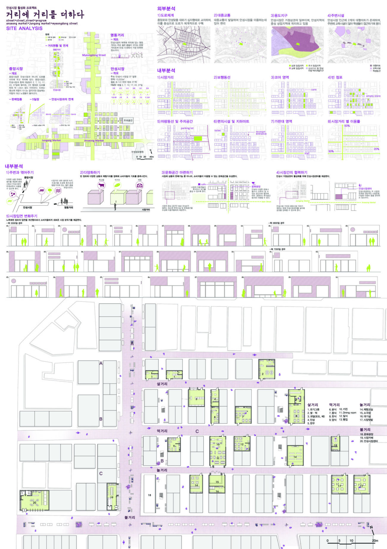 빈 점포에 다양한 프로그램을 조성하고, 시장에 판매 기능 뿐 아니라, 소비자들이 이용할 수 있는 문화공간 조성 및 노후화된 점포의 입면을 개선함으로써 소비자들에게 새로운 시장 분위기를 제공하여 명동거리와 중앙시장의 이용객을 안성시장에 끌어들일 수 있도록 한 계획안.