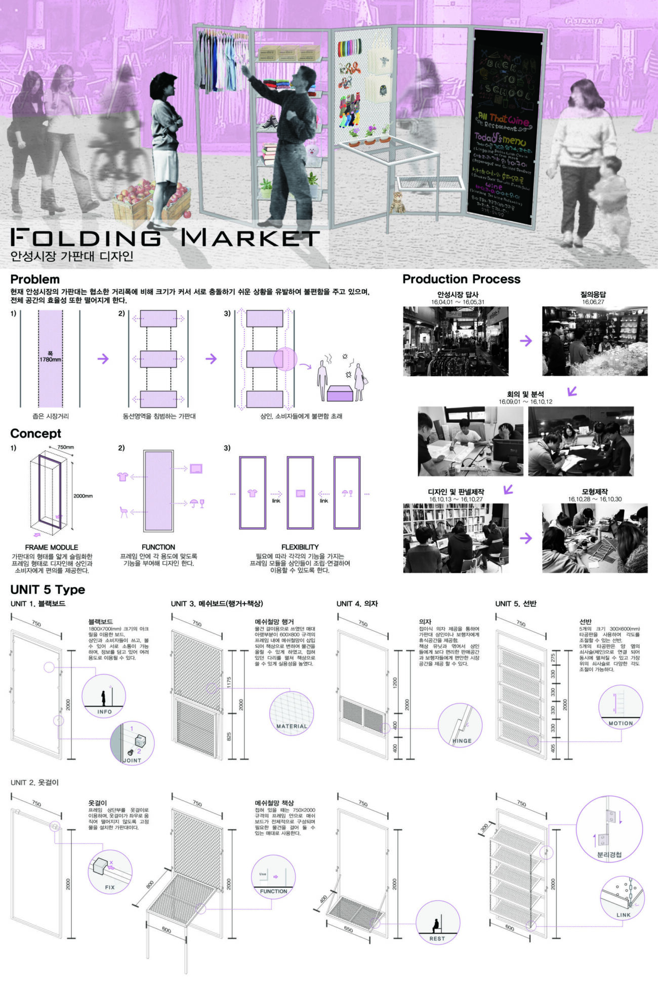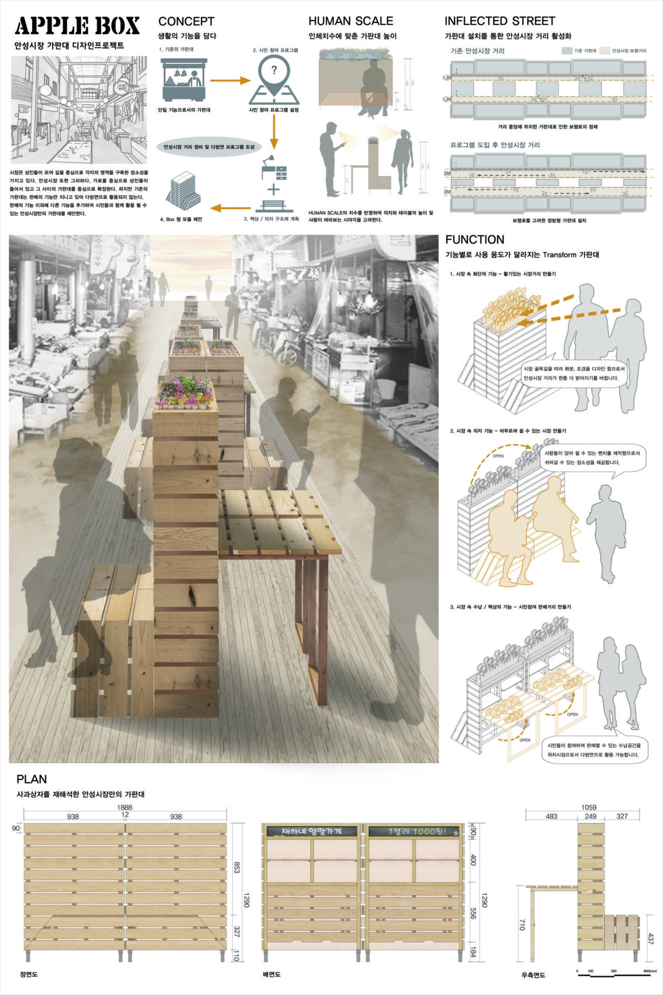 안성시장의 협소한 거리폭에 비해 크기가 커서 보행에 불편하던 기존 가판대의 형태를 얇고 슬림화 한 프레임의 형태로 디자인하여 협소한 시장 거리에서 공간의 효율성을 높일 수 있는 디자인을 제안 하였다.