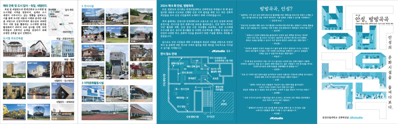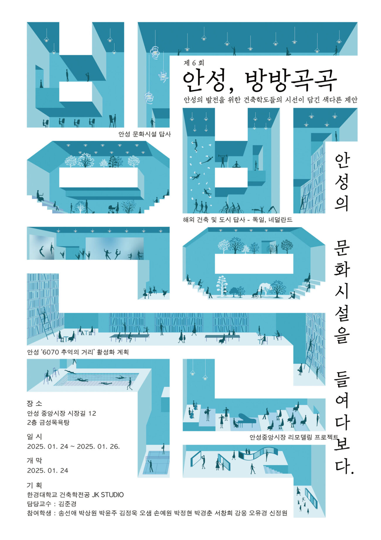 이번에 6회를 맞이하게 된 안성, 방방곡곡 전시회는 한경국립대학교 디자인건축융합학부 건축학전공 학생들이 한 해 동안 답사한 내용과 교과 및 비교과로 진행한 안성 지역발전을 위한 크고 작은 건축적 제안들을 모아 시민들에게 소개하기 위해 시작하였습니다.