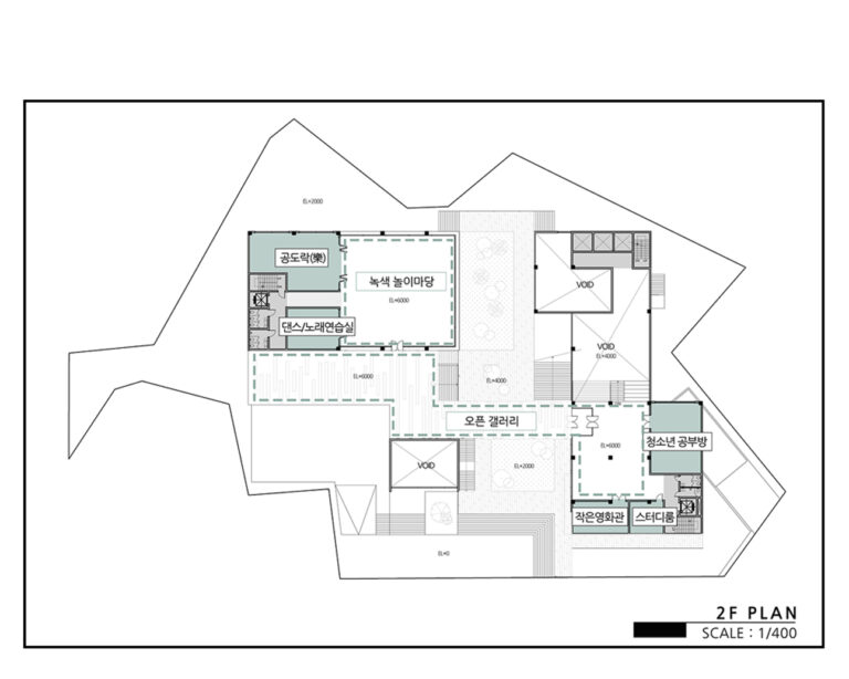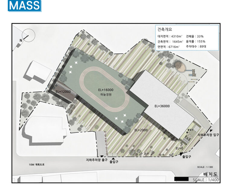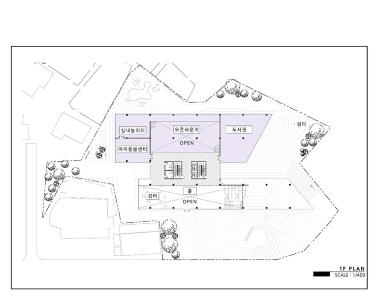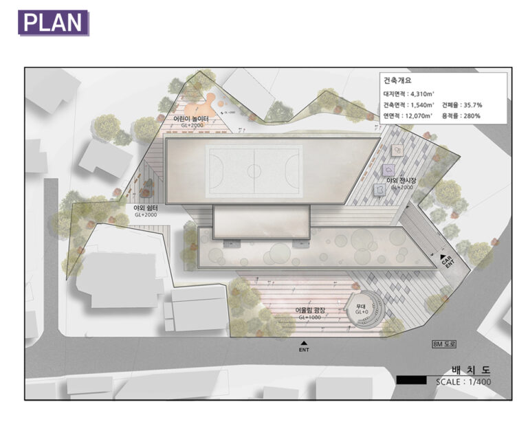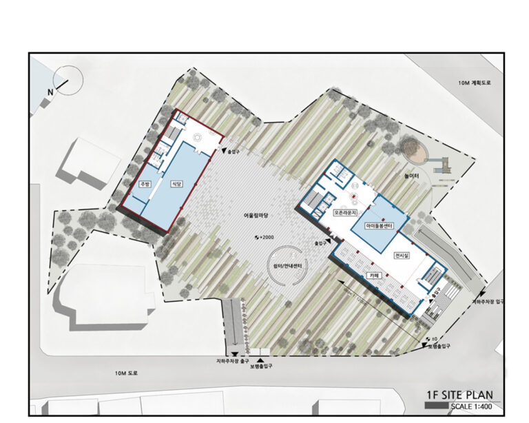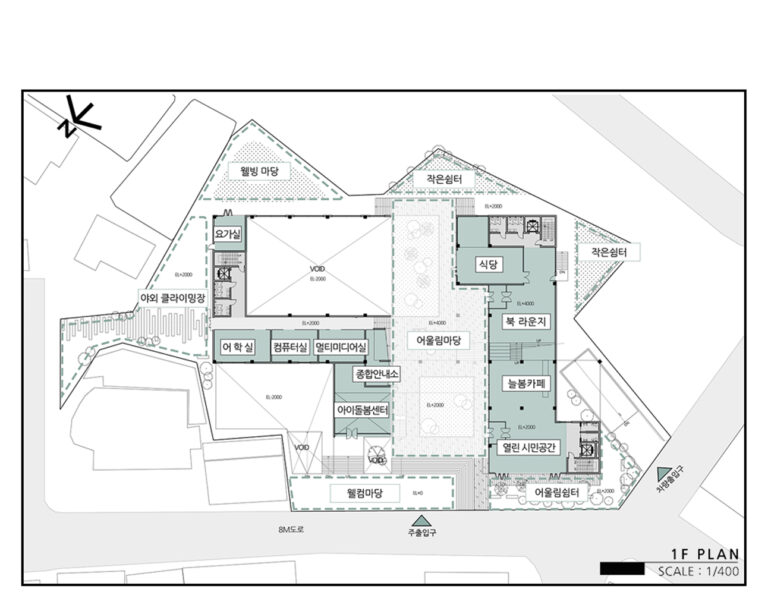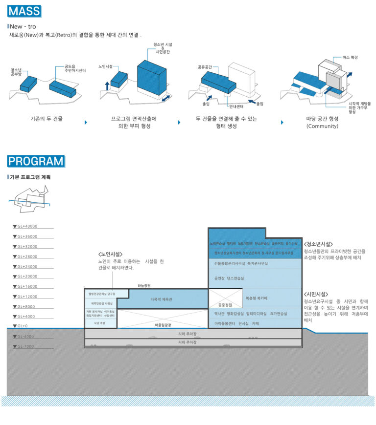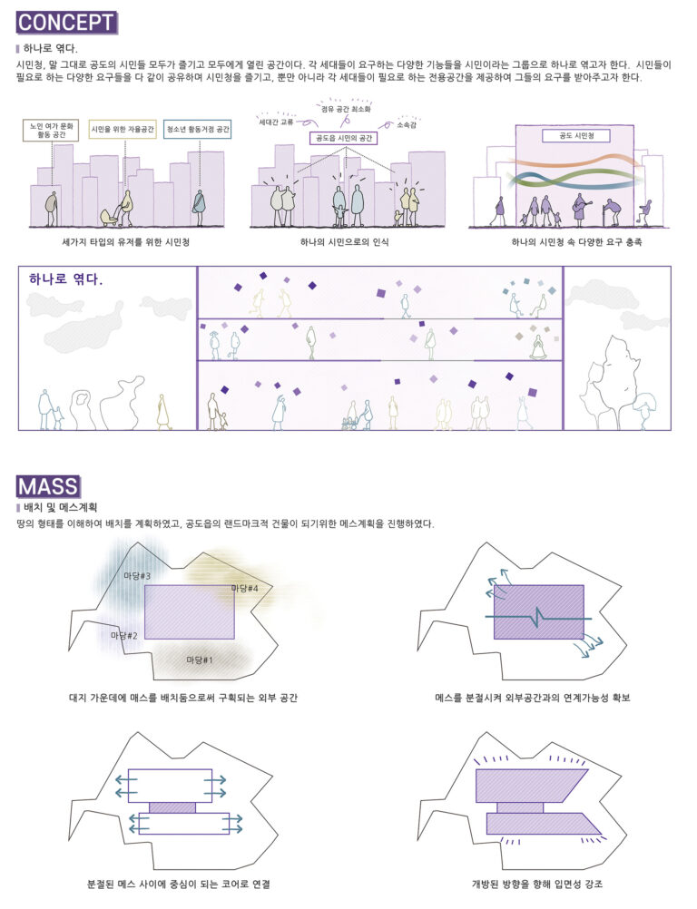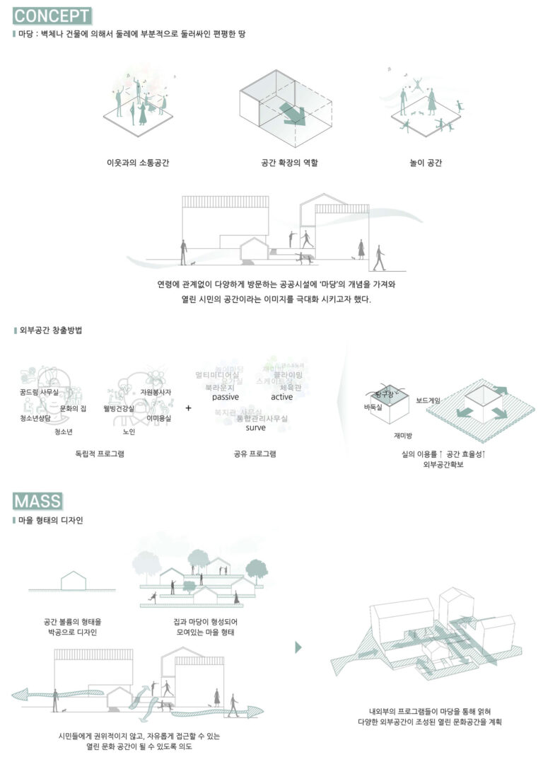 연령에 관계없이 다양하게 방문하는 공공시설에 ‘마당’의 개념을 가져와 열린 시민 공간이라는 이미지를 극대화 시키고, 내외부의 프로그램들이 마당을 통해 얽혀 다양한 외부공간이 조성된 열린 문화공간을 제안한다.