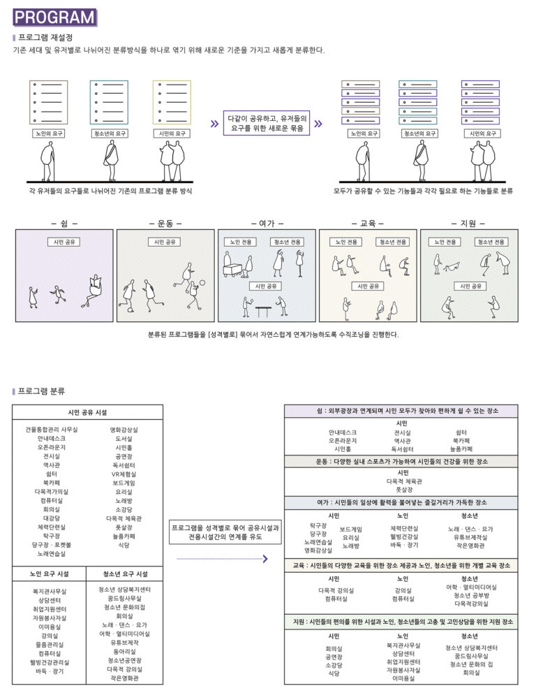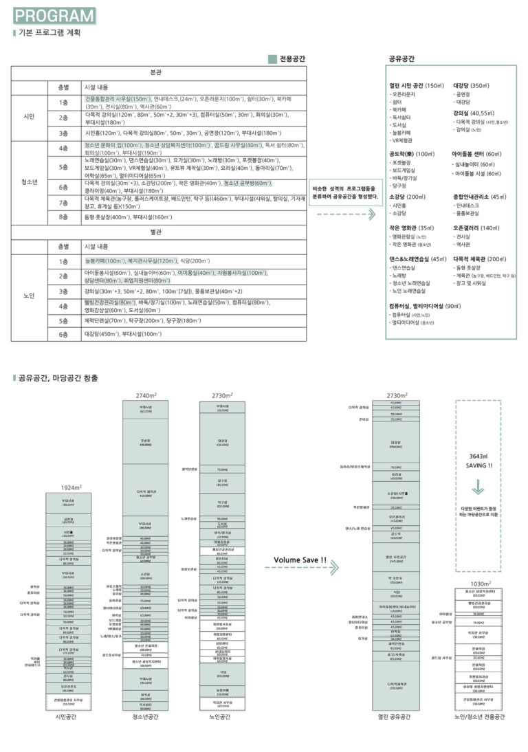 공도에 거주하는 각 세대들이 요구하는 다양한 기능들을 시민이라는 그룹으로 하나로 엮어서 모두를 위한 공유공간을 제공하면서, 각 세대들이 필요로 하는 전용공간도 하나의 건물에서 제공한다.