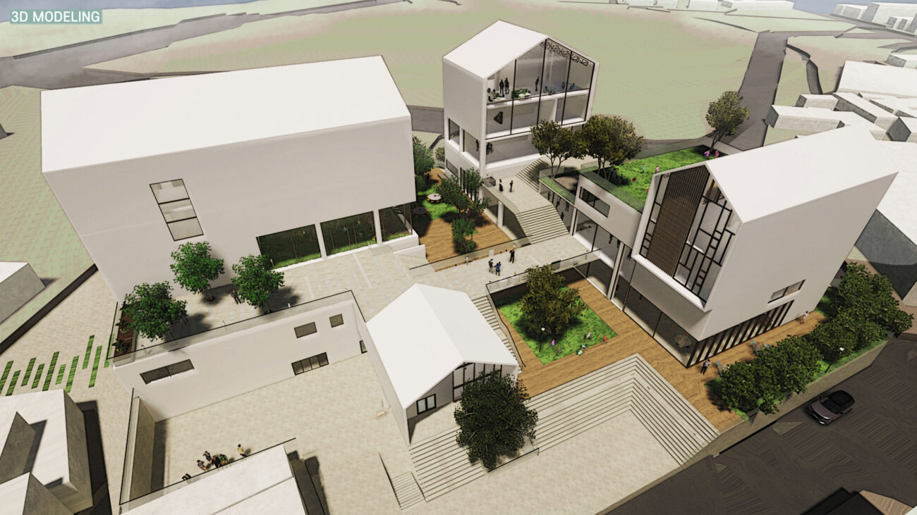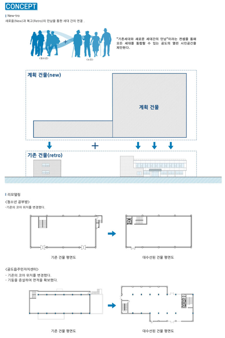 New-tro : “기존 세대와 새로운 세대간의 만남”이라는 컨셉을 통해 모든 세대를 통합할 수 있는 공도의 열린 시민공간을 제안한다.