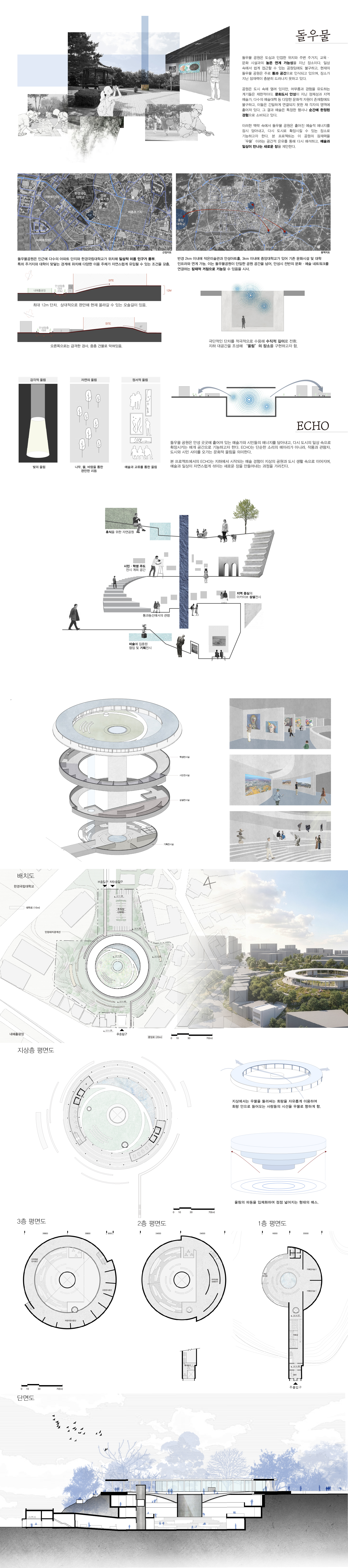 본 설계는 돌우물 공원이 우수한 접근성과 높은 연계 가능성이라는 잠재력을 지니고 있음에도, 이를 충분히 활용하지 못하고 있다는 문제의식에서 출발한다. 이에 우물 속 ‘울림’이라는 개념을 통해 문화도시 안성에 걸맞은 미술관을 제안한다.