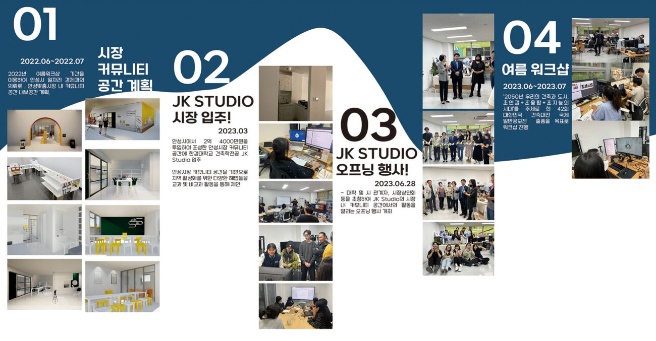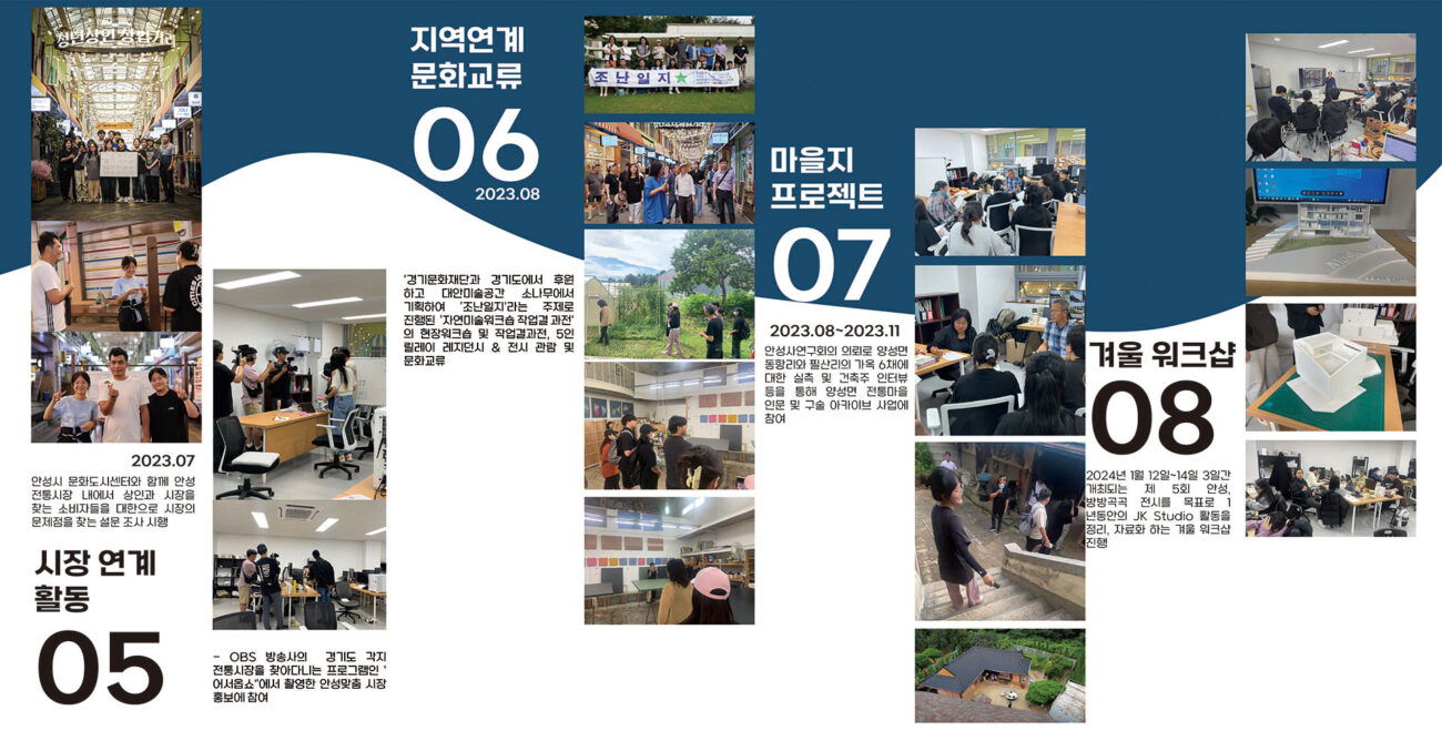 제 4회 <안성, 방방곡곡> 전시를 통해 제안했던 JK STUDIO 시장 커뮤니티 공간이 완공되어 3월부터 입주 후 도시 문화 및 도시 발전 사업을 중심으로 활동하기 시작했다. 안성 지역 및 도시계획 프로젝트를 통해 재생 및 개선 방안을 제안하고, 건축 프로젝트를 작업하는 등 1년 동안의 안성 건축학도들의 흔적이 담겨있다.