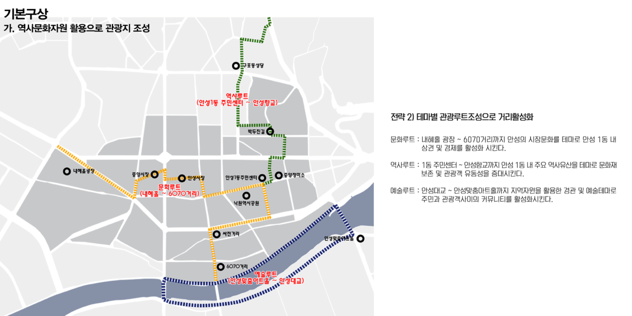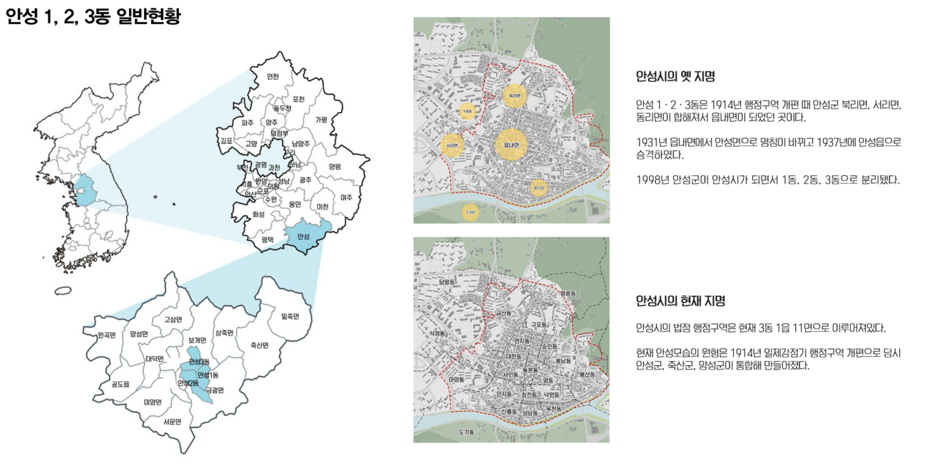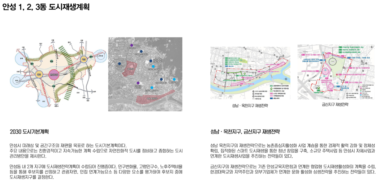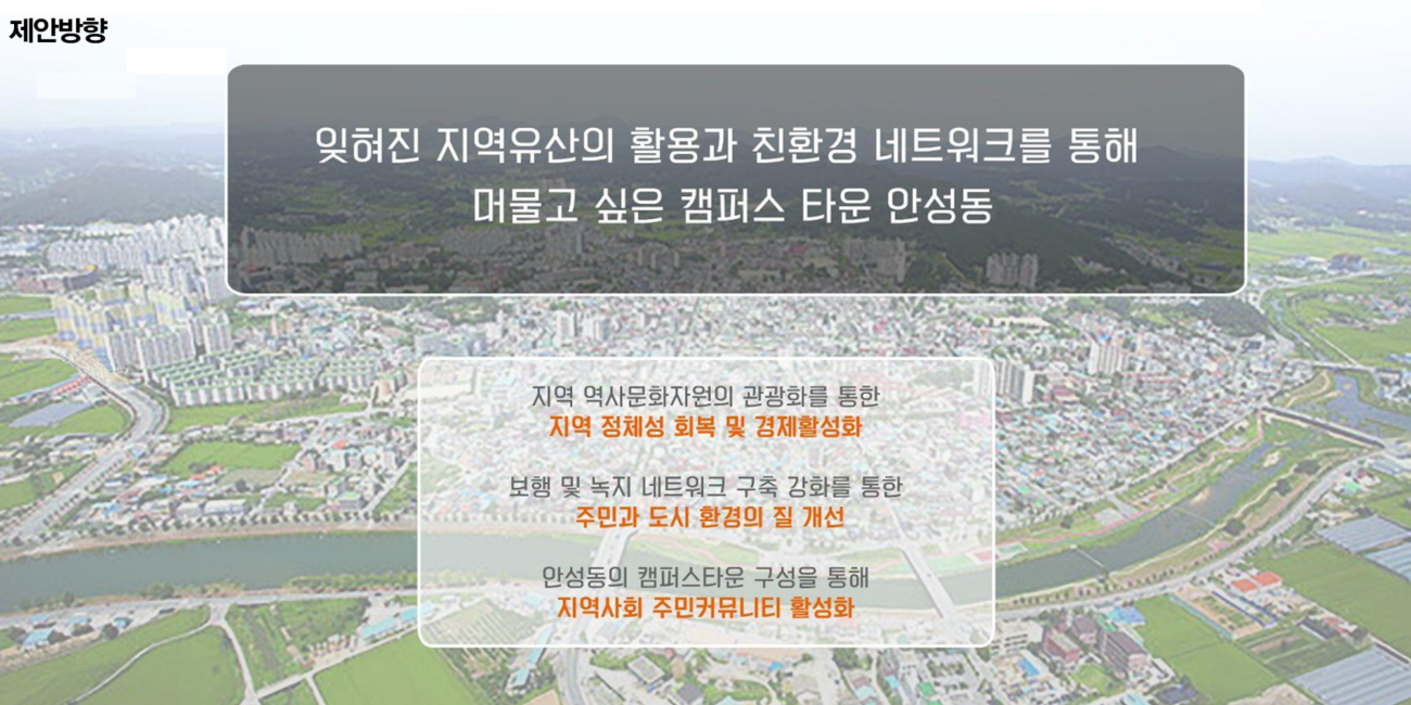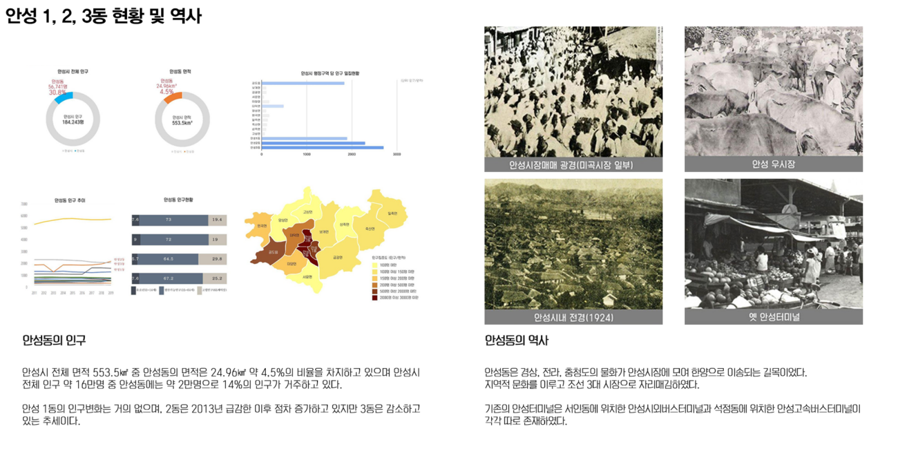 안성 1, 2, 3동은 안성시의 중앙에 위치해 있어 교통의 중심지이다. 또한 근대문화유산도 많이 분포되어 있다. 안성동의 지역활성화를 위해 거리활성화를 제안하려 한다. 지역 유산을 활용하며 친환경 네트워크를 통해 지역의 정체성을 회복하고 주민 커뮤니티를 활성화 하고자 했다.