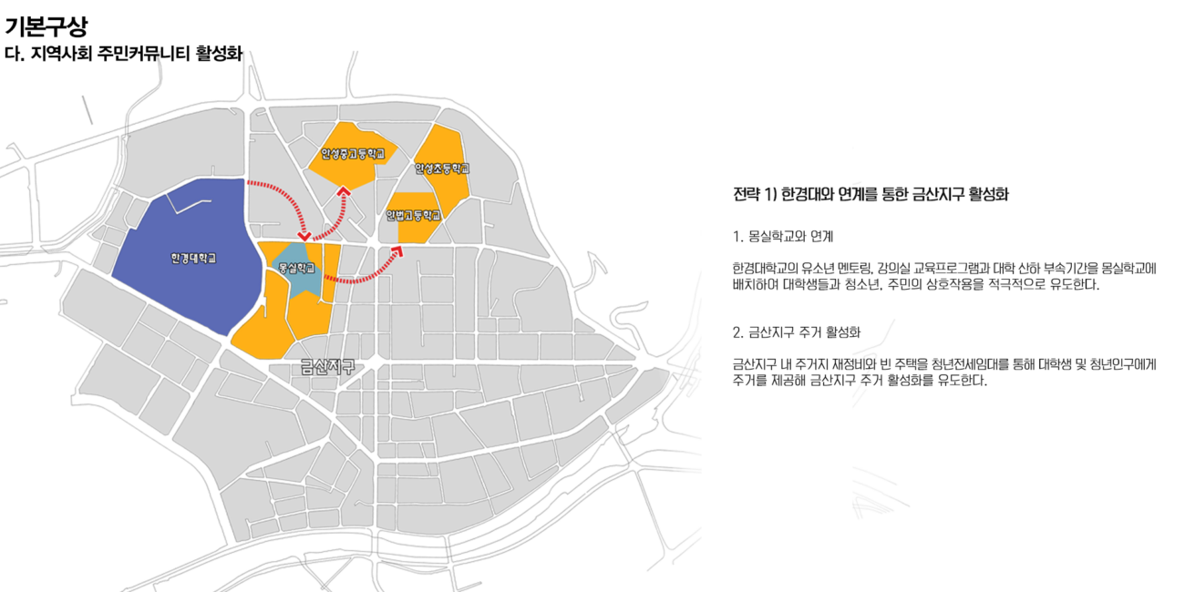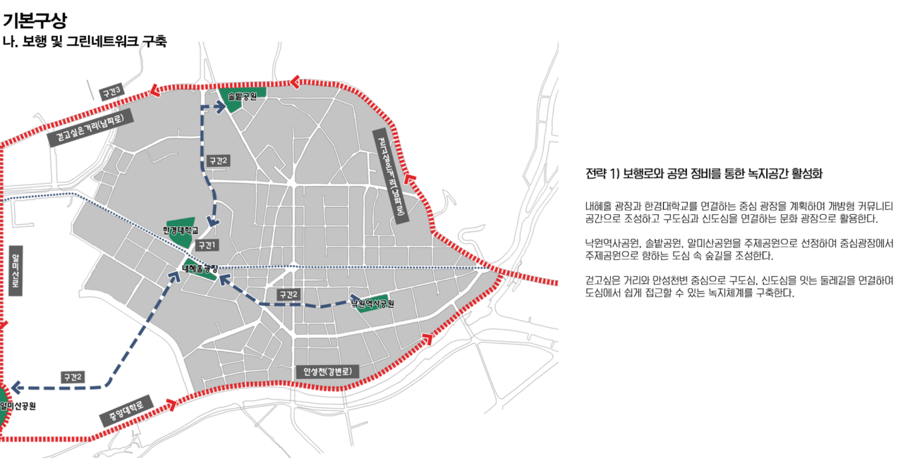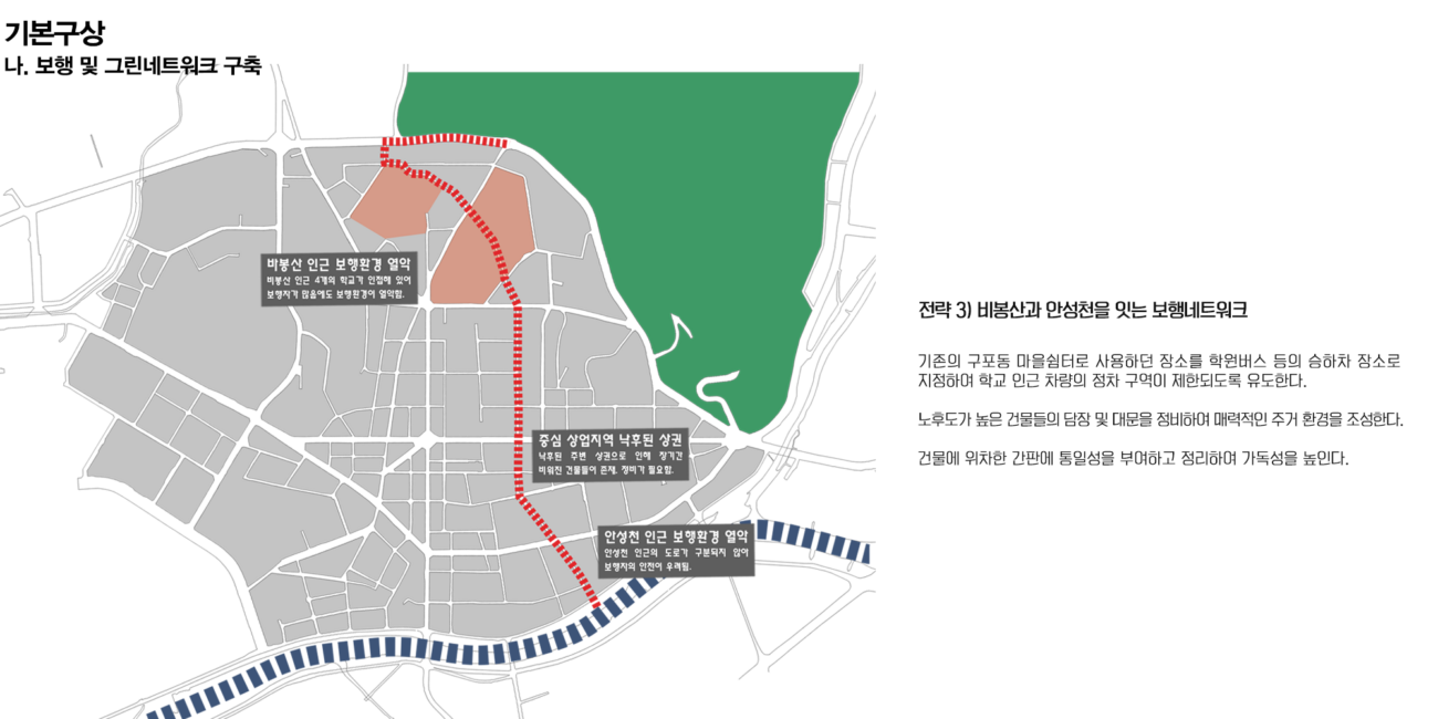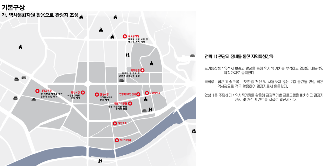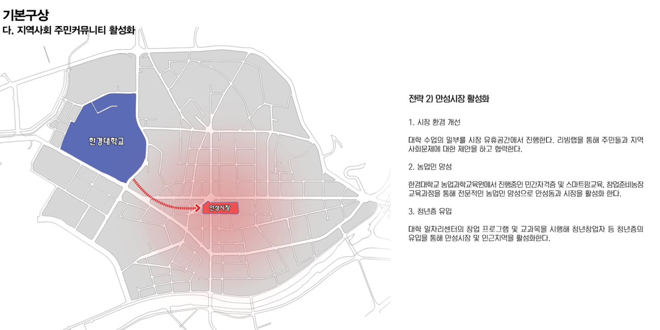 안성 1, 2, 3동은 안성시의 중앙에 위치해 있어 교통의 중심지이다. 또한 근대문화유산도 많이 분포되어 있다. 안성동의 지역활성화를 위해 거리활성화를 제안하려 한다. 지역 유산을 활용하며 친환경 네트워크를 통해 지역의 정체성을 회복하고 주민 커뮤니티를 활성화 하고자 했다.