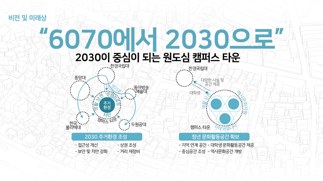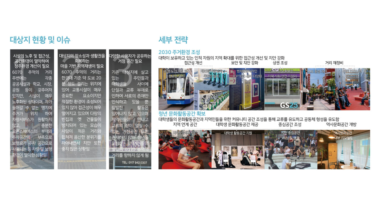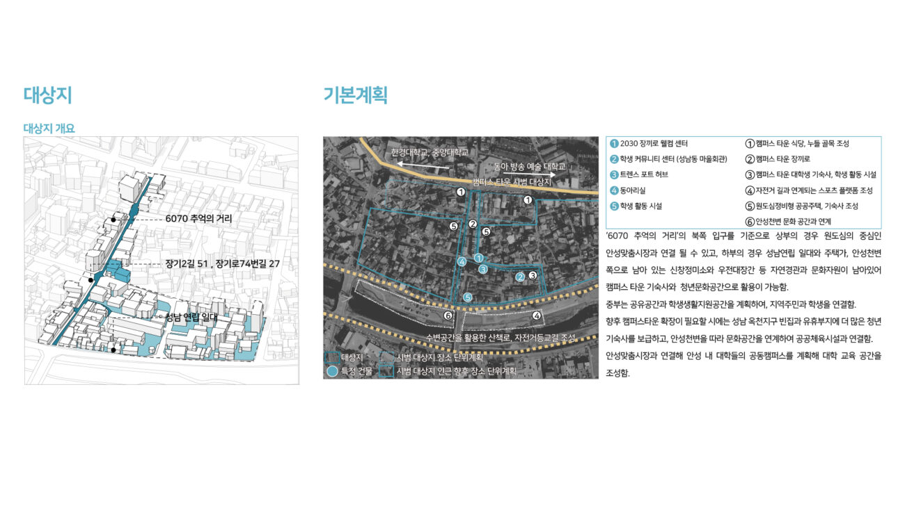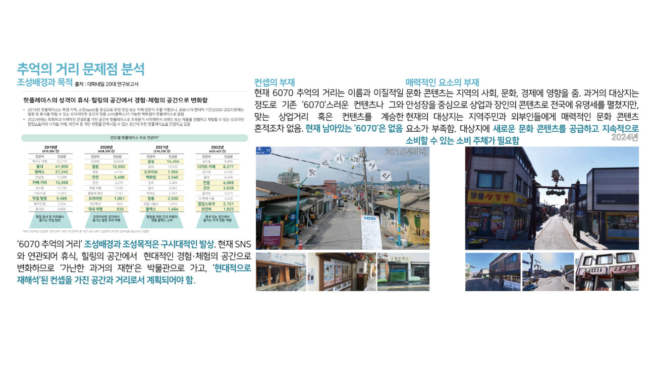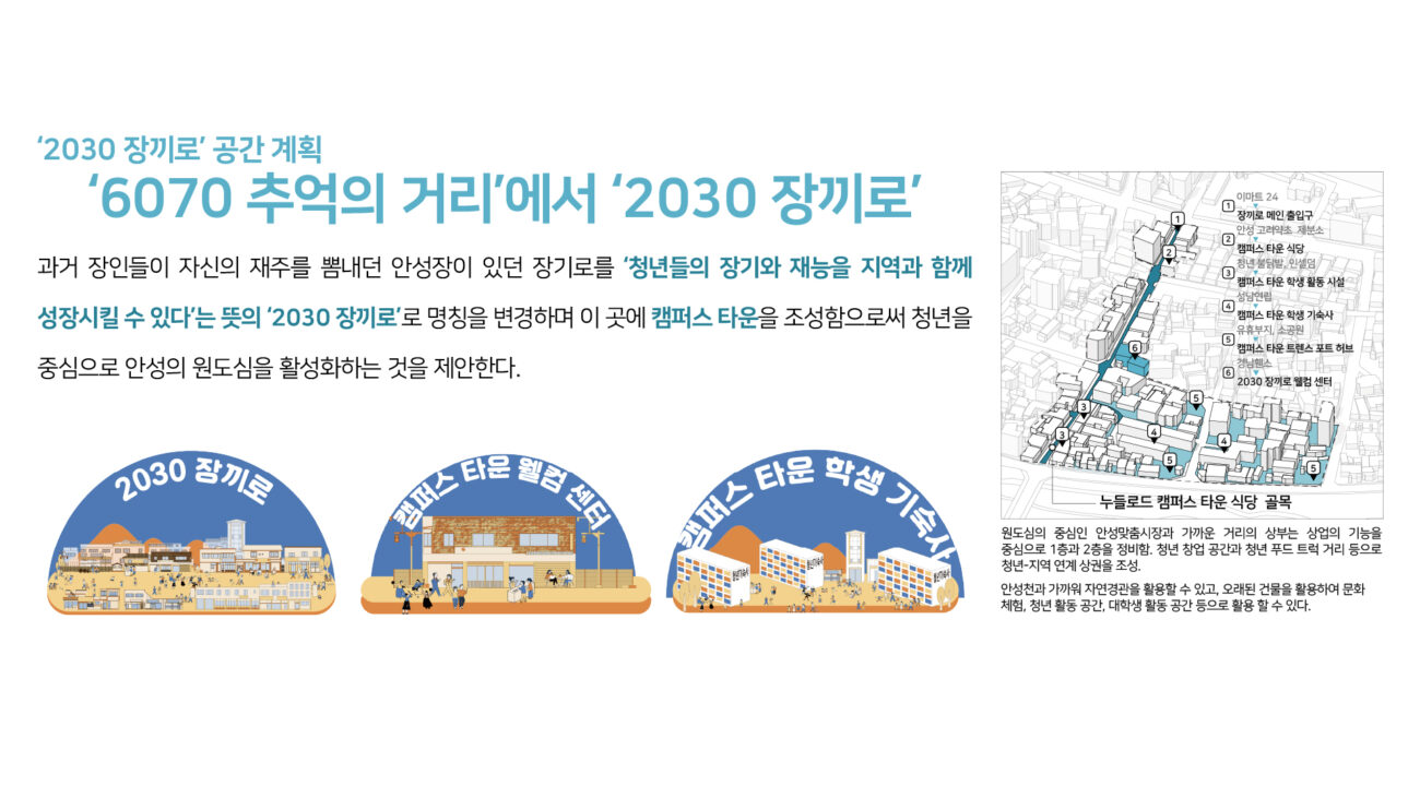 과거 안성의 ‘6070 추억의 거리’를 대상지로 답사 및 분석, 안성 학예사, 총괄 건축가 등의 실무자와의 회의 및 특강 등 다양한 측면에서의 분석 결과를 토대로 과거 안성장이 들어섰던 ‘6070 추억의 거리’를 중심으로 쇠퇴한 안성의 원도심을 활성화할 수 있는 방향을 안성을 거점으로 한 한경국립대학교 학생들의 관점으로 제시하였다.