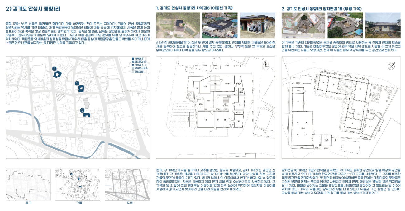 조사대상은 양성면 동항리, 필산리 2개 마을이다. 동항리와 필산리에 대한 문헌조사와 구술조사를 통하여 마을의 지리, 역사, 사회와 경제, 문화를 조사하여 아카이브 하는 것을 목적으로 한다.